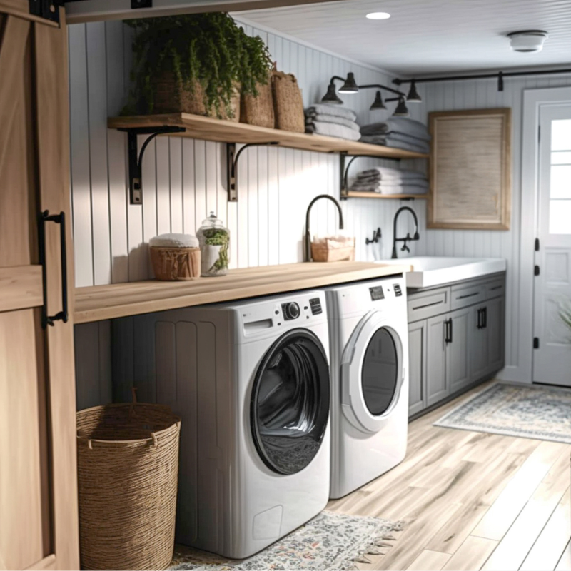 - Cellier entre cuisine et garage : buanderie + stockage